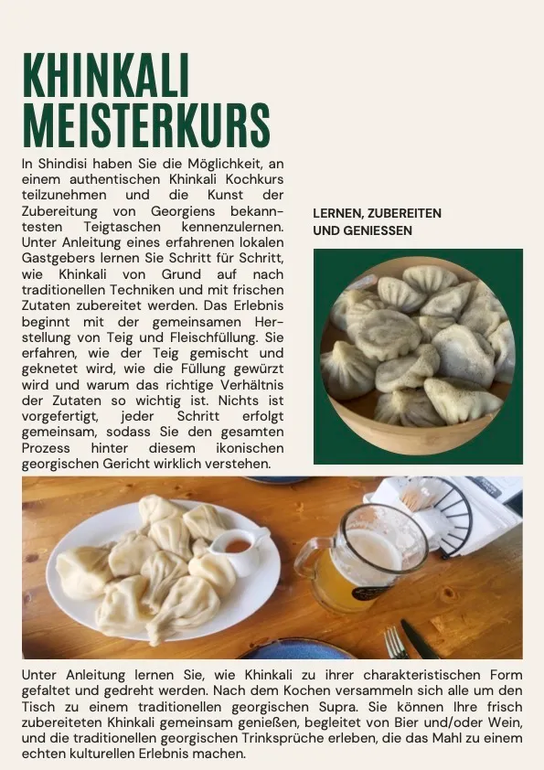 Tauche ein in die georgische Küche und lerne eines der bekanntesten Gerichte des Landes selbst zuzubereiten: Khinkali. In Shindisi, nahe Tbilisi, erwartet dich ein authentischer Kochkurs, bei dem du Schritt für Schritt in die Kunst dieser traditionellen Teigtaschen eingeführt wirst.